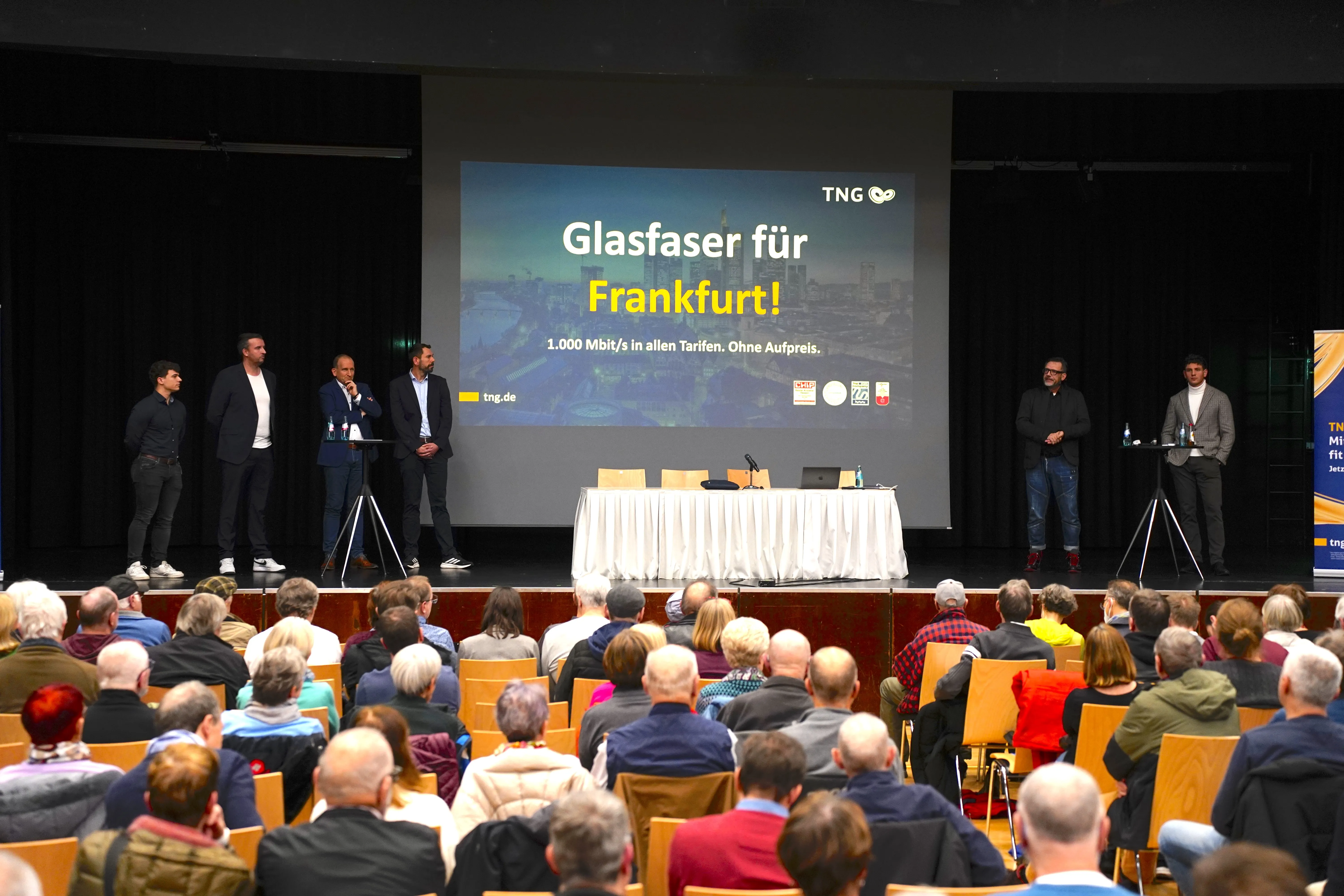 Auf der Bühne: Felix Kreuz (TNG Stadtnetz GmbH), Raphael Kupfermann (TNG Stadtnetz GmbH), Oliver Becker (Leiter der Stabsstelle Gigabit Performance-Center Stadt Frankfurt), Patrick Spengler (stellvertretender Leiter des Gigabit Performance Centers Stadt Frankfurt), Oliver Nissen (TNG Stadtnetz GmbH) und Kilian Ortwein (TNG Stadtnetz GmbH).