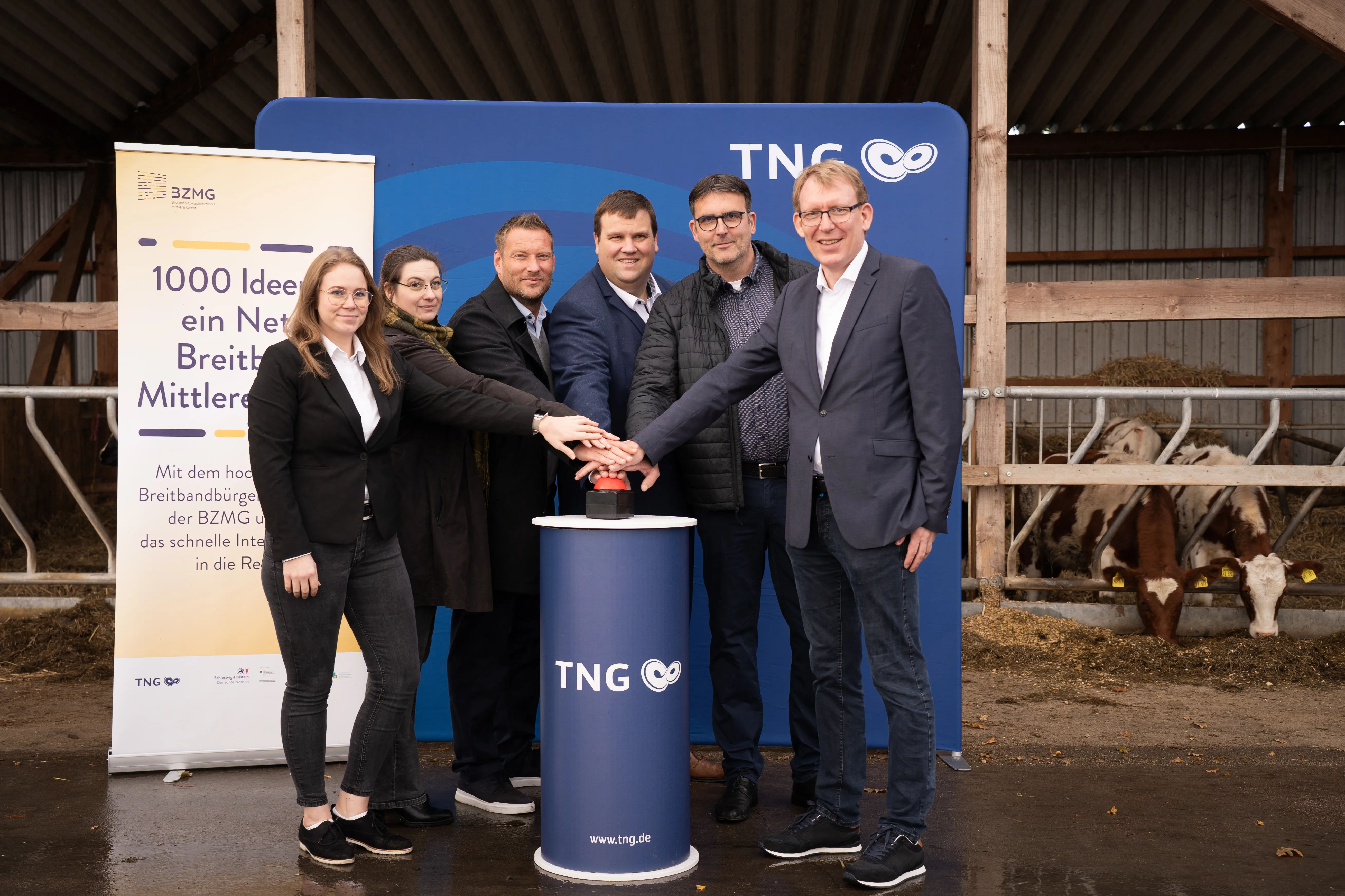 Anlässlich dieses bedeutenden Schritts kamen Vertreter der Gemeinde, des Breitbandzweckverbands Mittlere Geest (BZMG), des Projektträgers Aconium, des Breitband-Kompetenzzentrums Schleswig-Holstein, der TNG Stadtnetz GmbH sowie des ausführenden Bauunternehmens EMS GmbH auf dem Hof der Familie Börm in Stapel zusammen.