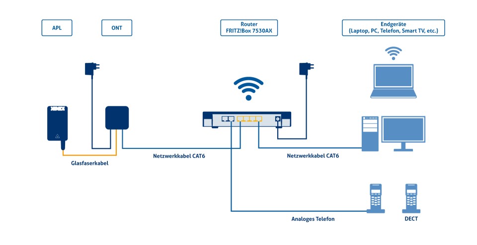 So schließen Sie ONT, Router (FRITZ!Box) und Endgeräte an